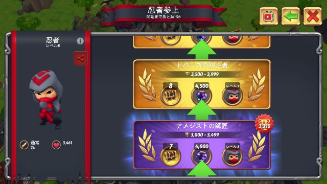 忍者イベント開始時のトロフィー数に応じて、階級ごとにグループ分けされる