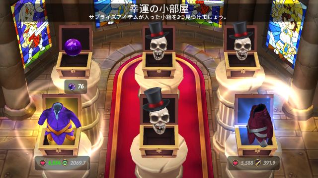城門を破壊する事に成功した場合は、追加の宝箱を獲得できる運命の小部屋に入ることができます。運命の小部屋では全部で6つの宝箱を、1つづつ開き、アイテム、ジェム、ゴールド、パール、引換券などアタリが出たら次の箱が開け、髑髏のハズレが出たら未開封の宝箱が残っていてもそこで終了します。