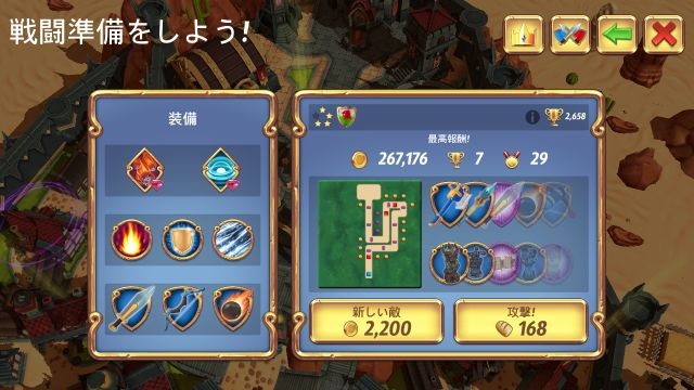 攻撃前に、勝利時に褒賞として得られる ゴールド、メダル、トロフィーの最大値が表示されます。これは、プレイヤーが達成率100%の完全勝利した場合に取得できる物になっています。