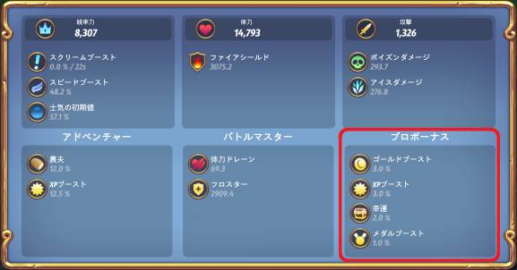 | ブースト | 10% | 17% | 25% | 33% | 8% | フォーチュン | 戦闘中に獲得できるゴールド量が増えます。 | |||||