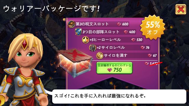 パッケージはジェムで購入できる複数の特典がまとめられたもので、元の特典の総計よりも大幅に割引されています。