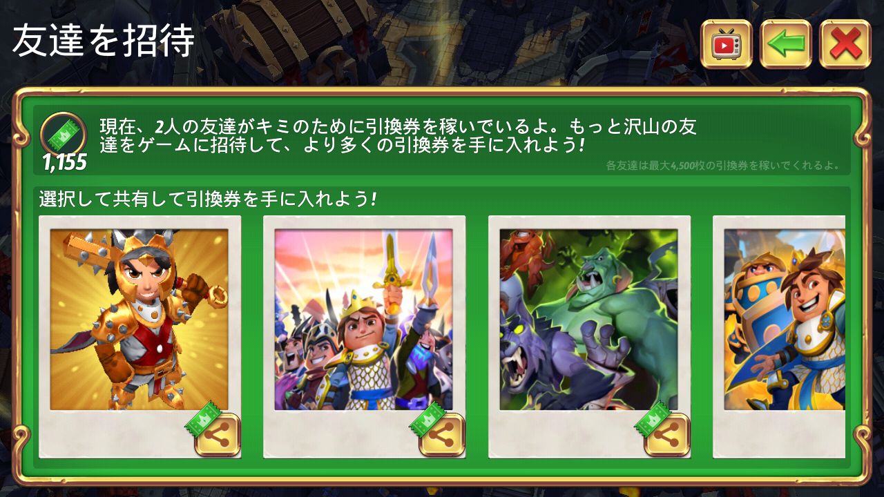 - あなたの招待でRoyalRevolt2を始めた友人が成長する度にあなたは引換券を得ることができます。あなたの友人もあなたが成長するたびに引換券を得る事ができます。