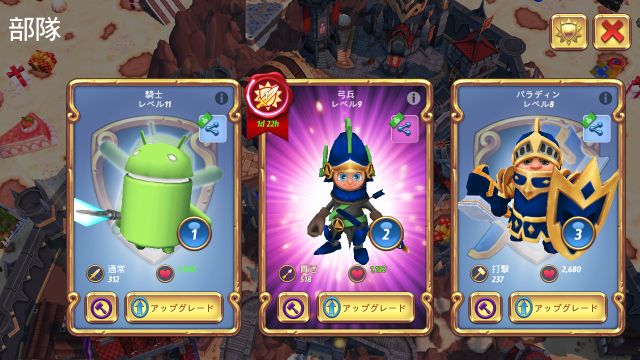 Android版では、騎士の見た目をAndroidのマスコットドロイドくんに変更する事ができます。方法は簡単で、城門から環境をハッピーバースデイに変更するだけです。